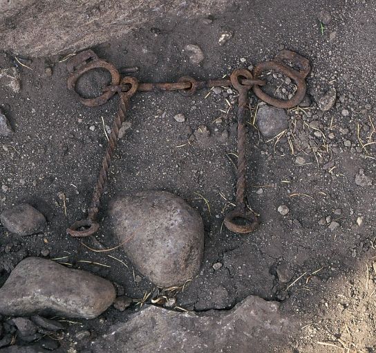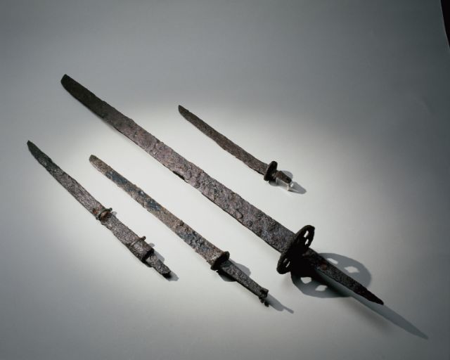古墳時代の終わり(7世紀後半)に築造されためがね塚1号墳から出土しました。全長92㎝を誇る直刀や短刀3振の他に轡と呼ばれる馬具が出土した事から埋葬者が馬の牧経営に関わったと推察されます。