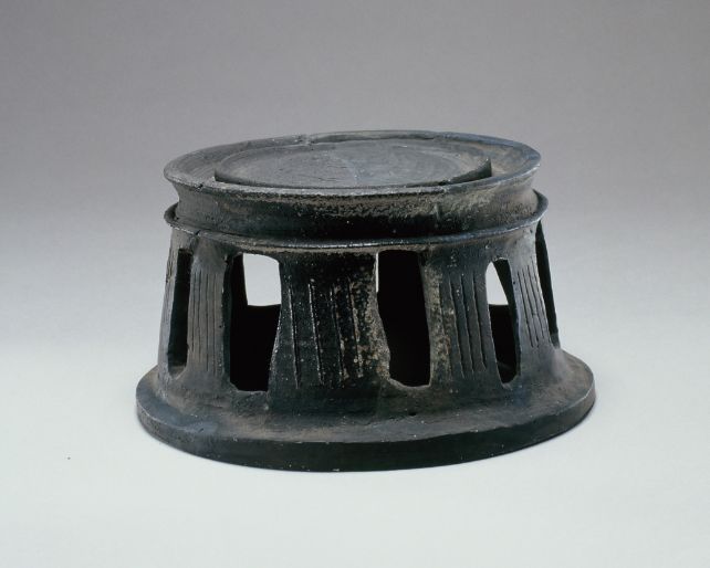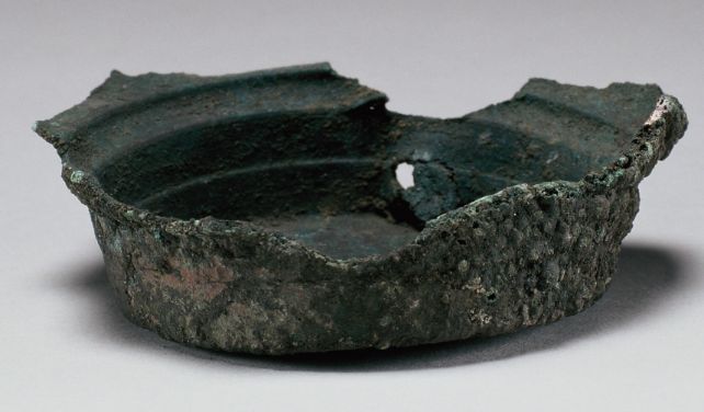 平安時代(10世紀初頭)の銅に鉛などを含んだ合金製の火熨斗。火熨斗は、現在でいうところのアイロンと同じ機能をもった道具で全国的に出土例が少ないです。