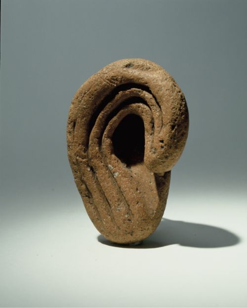 縄文時代後期の墓坑から出土しました。耳の形を模した土製品で大きさは実際の耳と同じくらいで、全国的にも珍しい土製品になります。