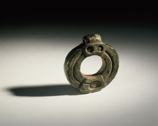 縄文時代後期の墓坑から出土しました。滑石製でイモガイを模して作られたと考えられます。表面に赤いベンガラが付いており、かつては真っ赤なペンダント状の飾りであったと考えられます。
