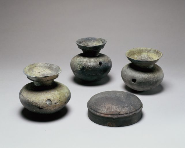 古墳時代(5世紀)の須恵器。須恵器生産が国内で始まった頃に陶邑窯(大阪府)などから当地域にもたらされたと考えられます。手前の1点がフタ、残りの2点がハソウと呼ばれています。