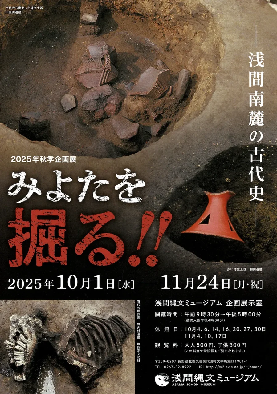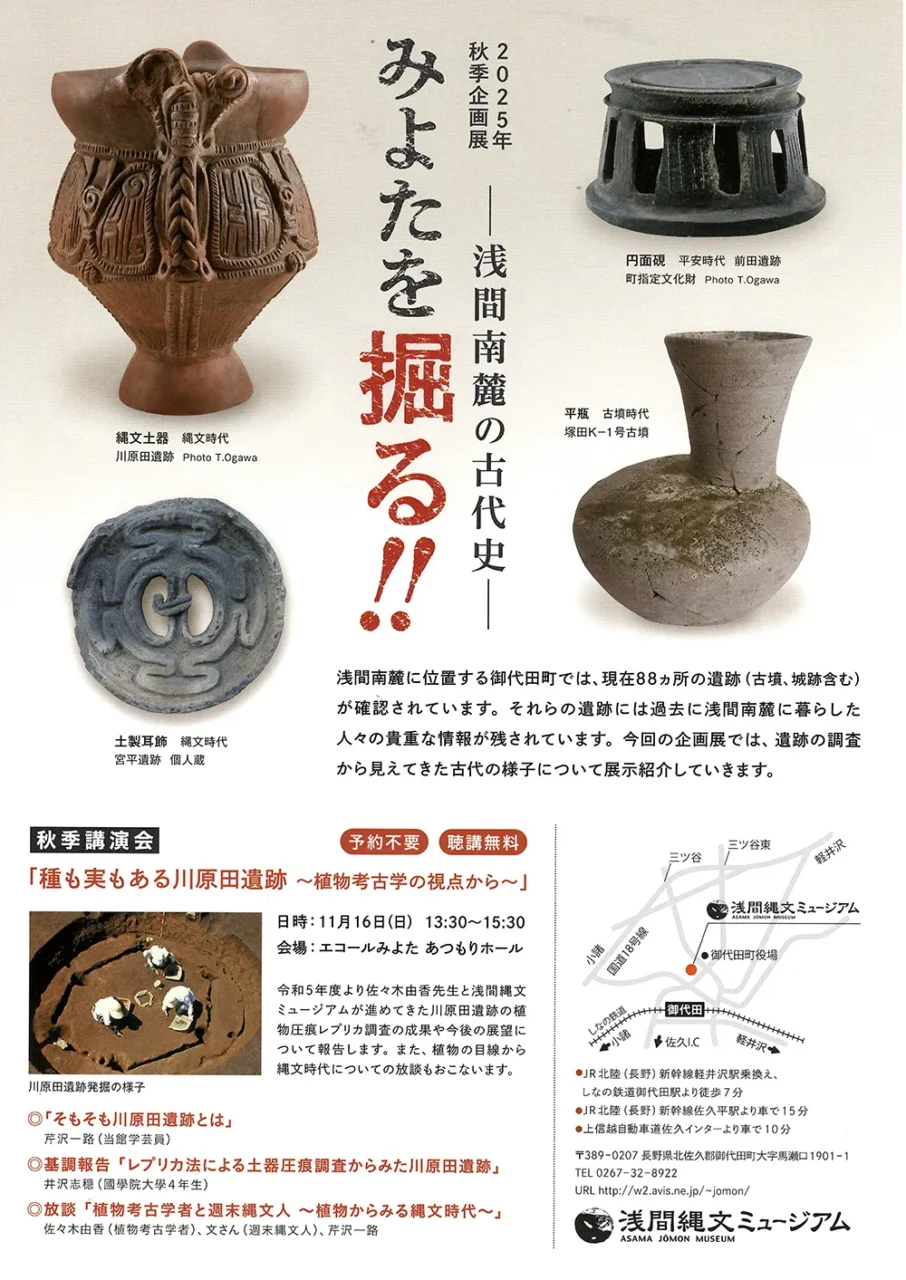 2025.11.13 企画展 秋季企画展「みよたを掘る‼-浅間南麓の古代史-」 浅間南麓に位置する御代田町の縄文時代から平安時代までの様子について紹介する企画展です。 会 期 2025年10月1日(水)~11月24日(月祝) 時 間 午前9時30分~午後5時まで(最終入館午後4時30分) 休館日 月曜日と祝日の翌日ほか(ご利用案内をご覧ください) 浅間縄文ミュージアム 企画展示室 ※入場有料(常設展観覧とあわせて) 新着情報一覧